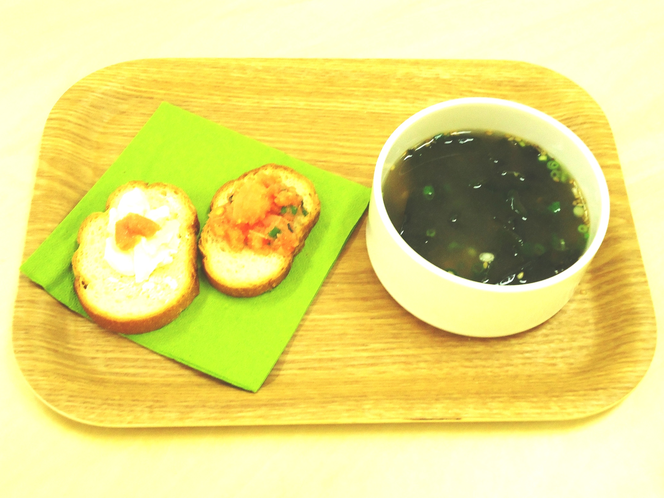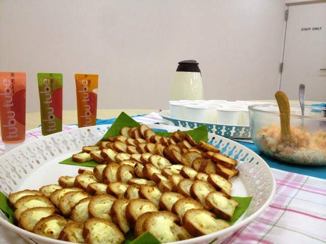 tubutube3種(粒明太子+バジル、オレガノ、ごま油)をクリームチーズやマヨネーズマッシュポテトの上にのせ、トーストしたバケットの上にトッピング♪