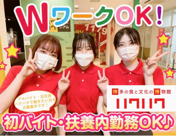 明太子のふくやが運営する博多の食文化を体験できる施設で働くスタッフを募集します。人と話すことが好きな方、サービス業に興味のある方!未経験の方大歓迎!先輩スタッフが丁寧に教えていきます。イベントも多く作り上げていくことや、人を楽しませることが好きな人にも向いています。地元企業で安心して長く働くことができます。福岡・博多の魅力を一緒にPRしてきましょう!