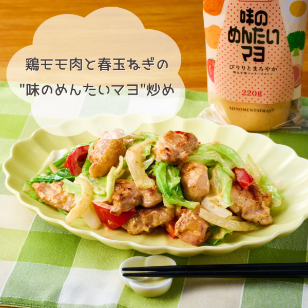 当館ハクハクのスタッフがおすすめする「明太子レシピ」をシリーズでお届けします。第4弾の今回は、春野菜をおいしくいただく「鶏モモ肉と春玉ねぎの”味のめんたいマヨ”炒め」(味のめんたいマヨ使用)をご紹介します。