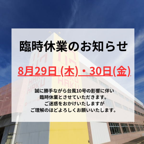 2024年8月29日(木)・8月30日(金)を臨時休業いたします。