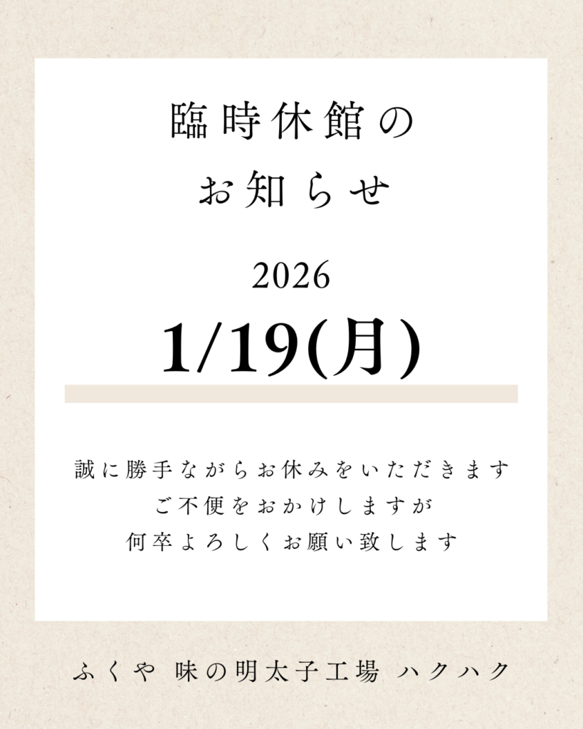 いつもふくや味の明太子工場ハクハク(博多の食と文化の博物館)をご愛顧頂き誠にありがとうございます。